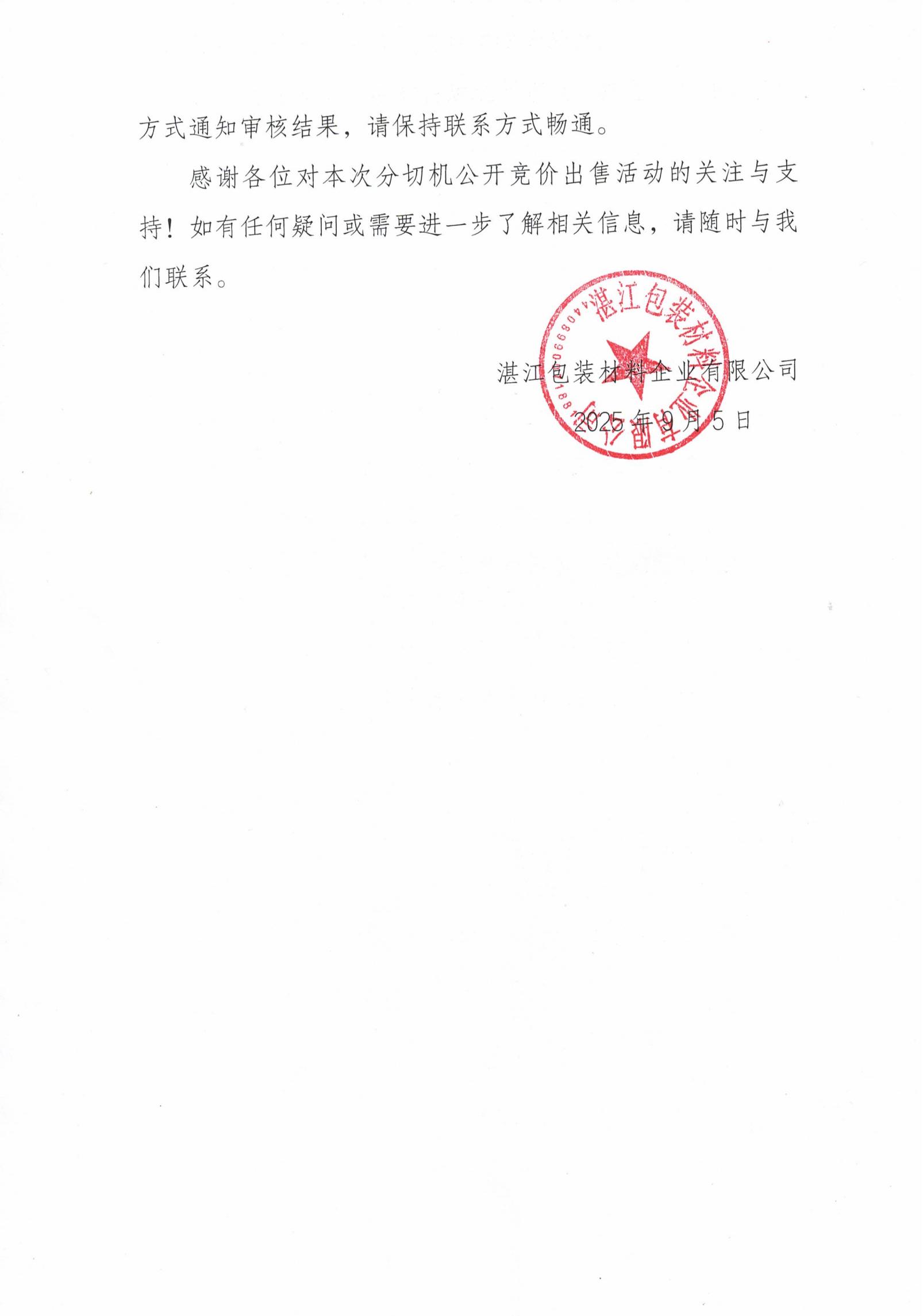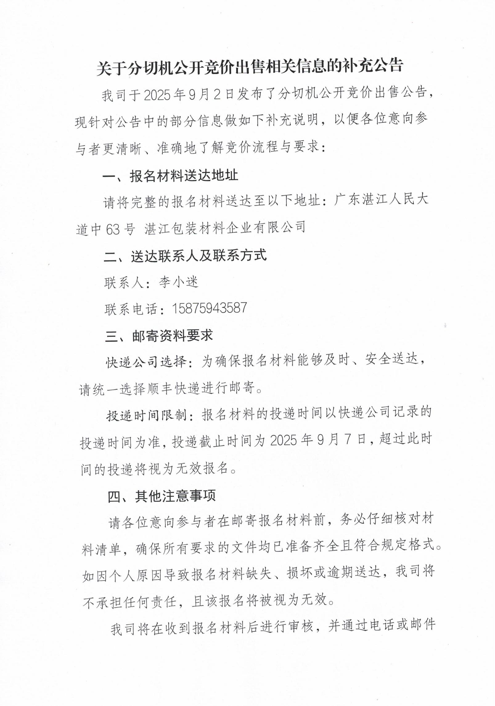 關(guān)于分切機(jī)公開競價出售相關(guān)信息的補(bǔ)充公告